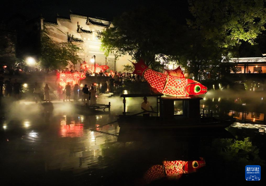 10月1日晚,在安徽省黄山市黟县秀里古村,鱼灯队伍在古村巡游(无人机照片)。新华社记者 杜宇 摄