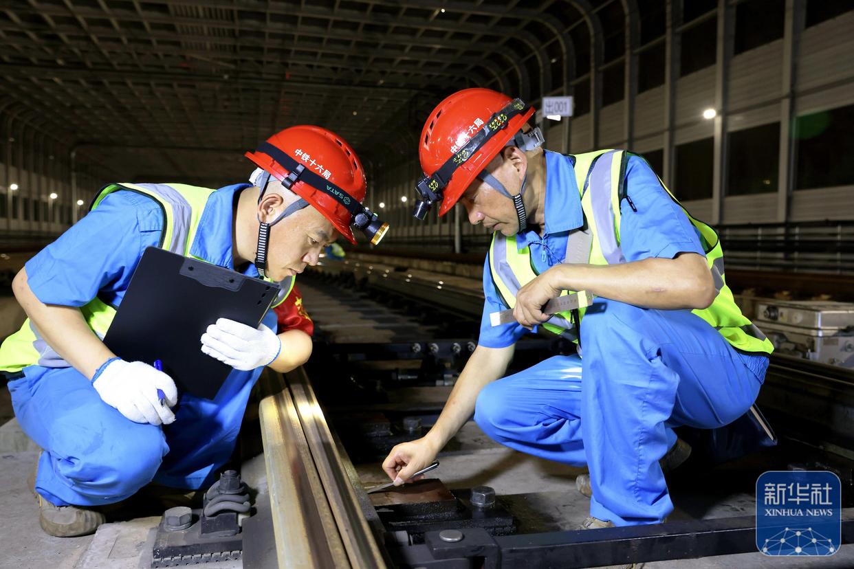 ↑ 10月4日,中铁十六局铁运公司维保人员在重庆轨道交通十八号线检测钢轨轨距。新华社发(付玉忠 摄)