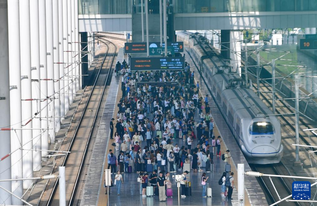 10月8日,旅客在江苏无锡火车站站台乘车。新华社发(还月亮摄)
