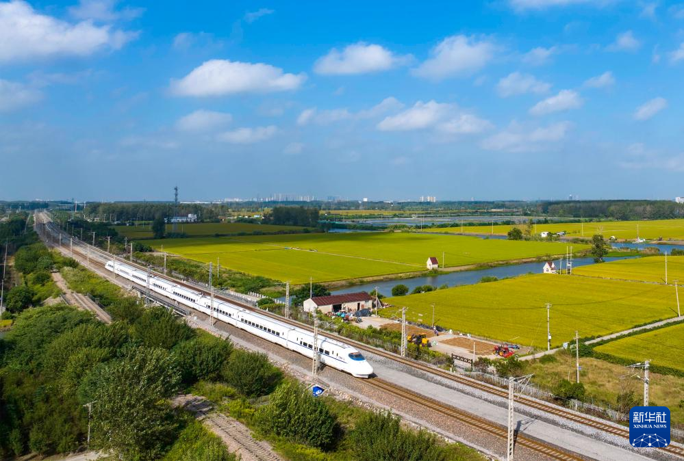 10月10日,列车行驶在宁启铁路江苏扬州段(无人机照片)。新华社发(任飞摄)