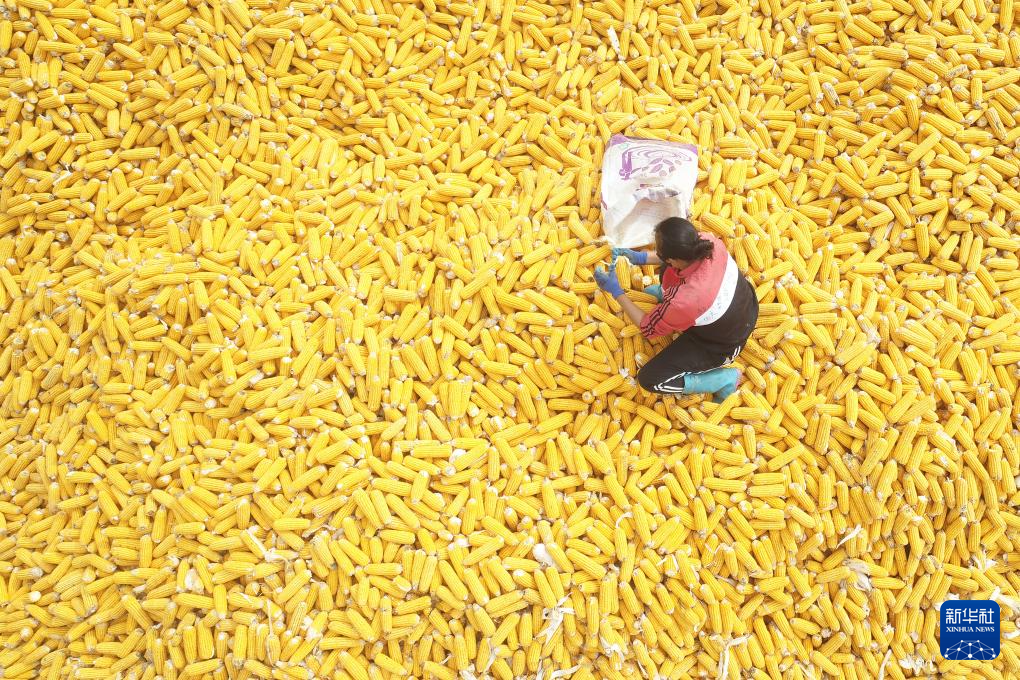 10月11日,云南省文山壮族苗族自治州广南县莲城镇那朵村的农民在晾晒收获的玉米。新华社发(熊平祥摄)