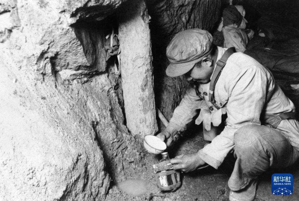 在上甘岭战役中坚守在坑道中的中国人民志愿军战士积蓄坑道岩壁上的渗水,以解决缺水问题。