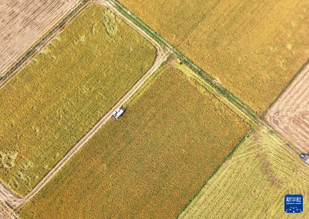 10月27日,河北省唐山市海港经济开发区王滩镇农民驾驶农机在收获水稻(无人机照片)。新华社发(刘满仓 摄)