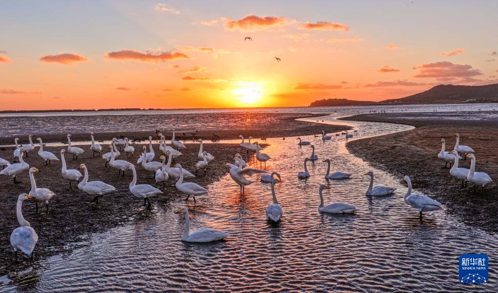 11月2日,在山东省荣成市成山镇天鹅湖湿地,大天鹅在栖息、觅食(无人机照片)。新华社发(李信君 摄)