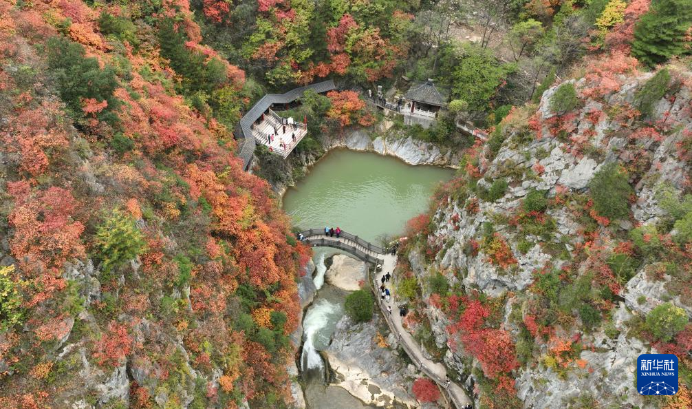 11月1日,游客在甘肃省陇南市成县西狭颂风景区欣赏秋日景色(无人机照片)。新华社发(冉创昌 摄)