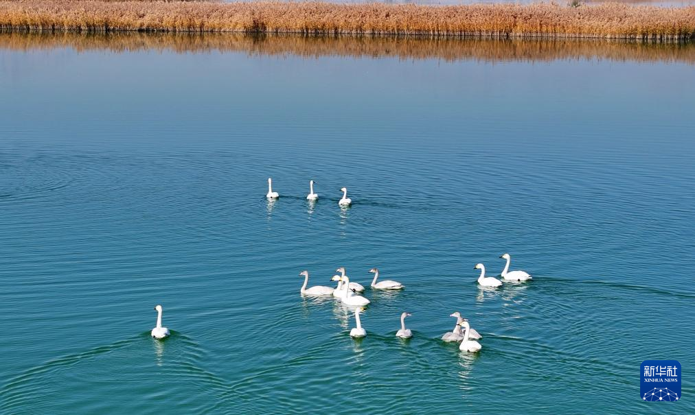 候鸟在宁夏银川市西夏区犀牛湖游弋(无人机照片,11月2日摄)。新华社发(李靖 摄)