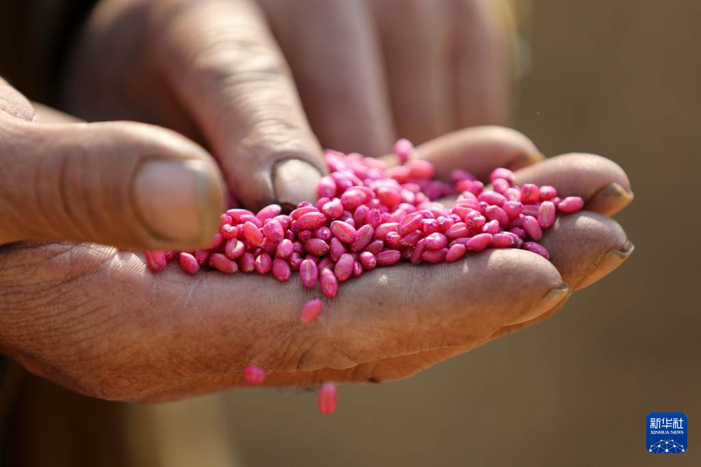 11月3日,河南省平顶山市宝丰县大营镇赵楼村农民在查看冬小麦种子。新华社发(何五昌 摄)