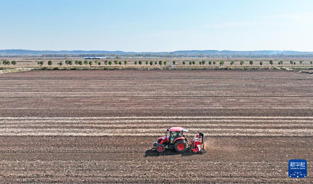 11月3日,在河北省石家庄新乐市化皮镇官庄村,农民驾驶农机播种小麦(无人机照片)。新华社发(贾敏杰 摄)