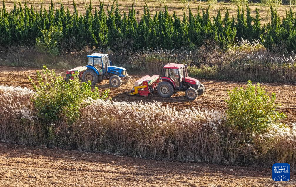 11月3日,河南省平顶山市宝丰县大营镇赵楼村农民驾驶农机播种冬小麦。新华社发(何五昌 摄)