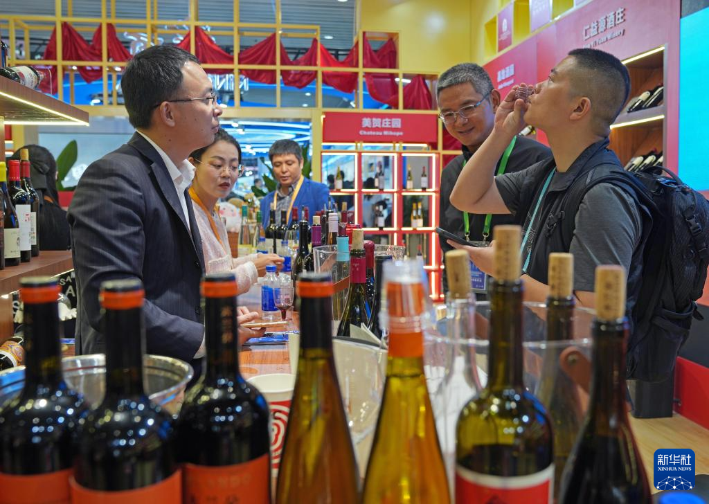 11月8日,参观者在第八届进博会宁夏馆品鉴葡萄酒。新华社记者 刘颖 摄