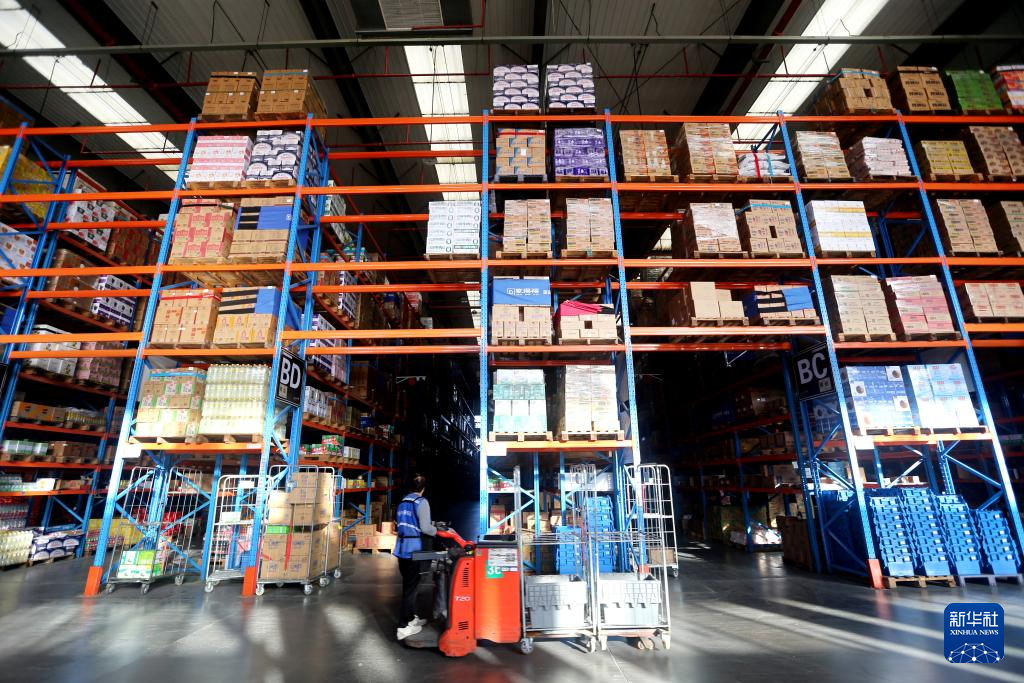 11月10日,在江苏省连云港市连云区一家电商物流仓库,工作人员在转运货物。新华社发(王春摄)