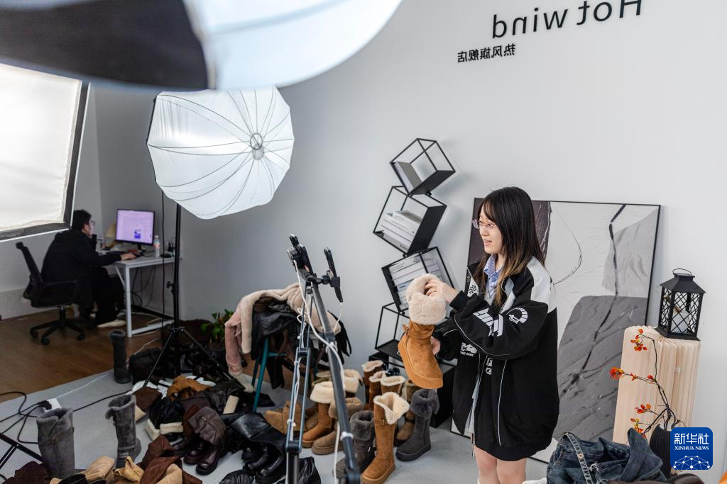 11月10日,在浙江省温州市瓯海区的一家网络科技公司,主播通过网络直播销售鞋子。新华社发(刘吉利摄)