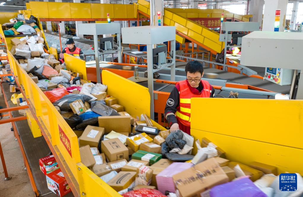 11月9日,在中国邮政集团有限公司河南省商丘市夏邑县分公司邮件处理中心,投递员在分拣包裹。新华社发(苗育才摄)