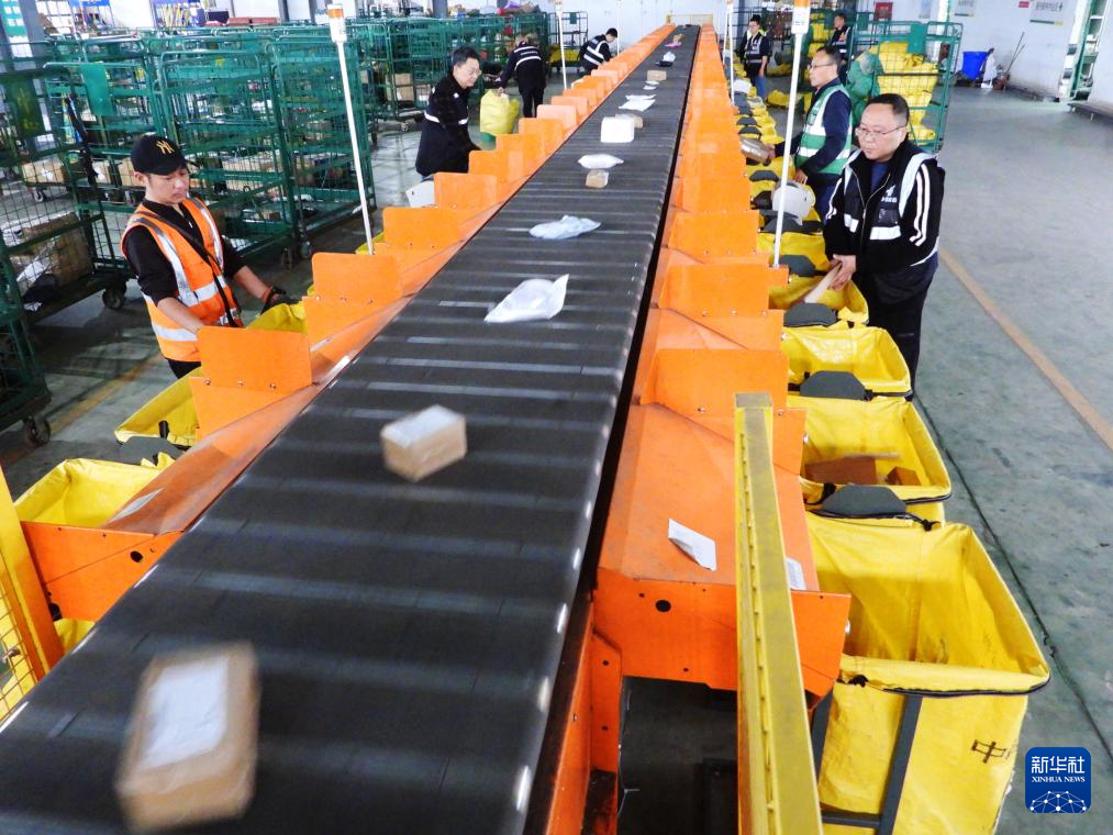 11月10日,在中国邮政速递物流股份有限公司四川省达州市分公司邮件处理分局,工作人员在智能快递流水线上分拣快递邮件。新华社发(邓良奎 摄)