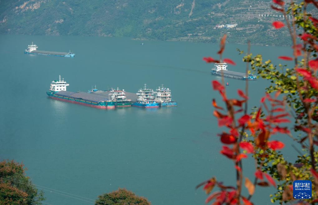 11月16日,船舶行驶在湖北省宜昌市秭归县西陵峡水域(无人机照片)。新华社发(雷勇摄)