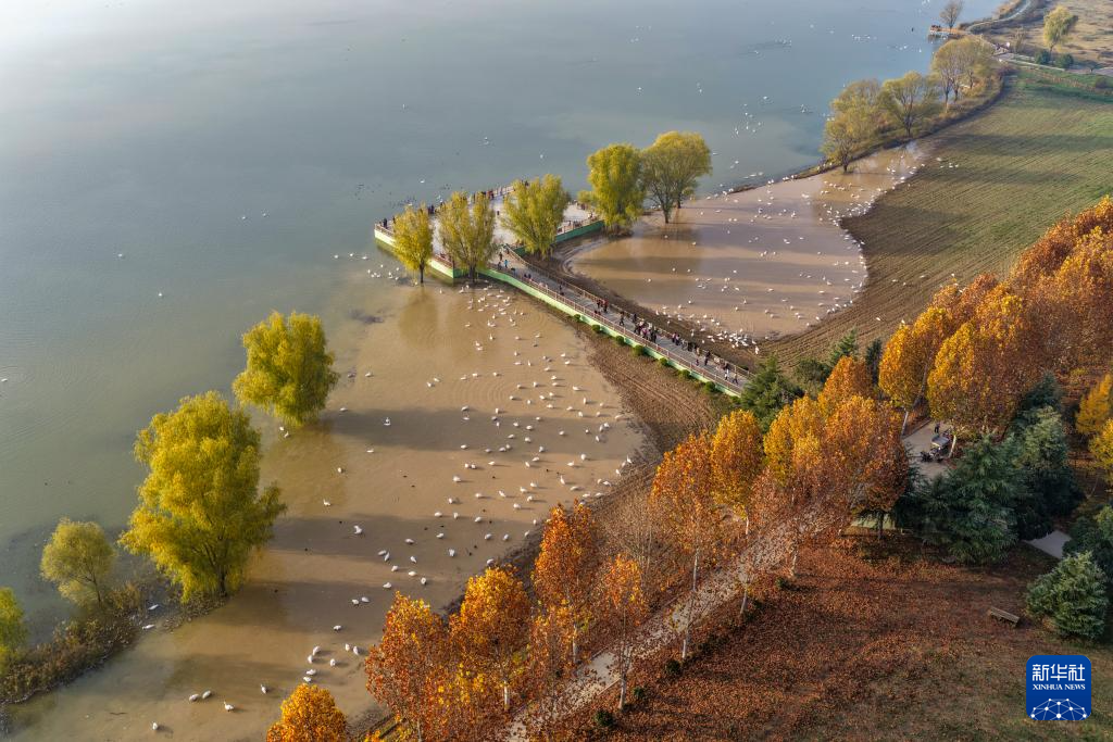 11月16日,游客在江苏南京明孝陵景区燕雀湖畔赏景游玩。新华社发(苏阳摄)