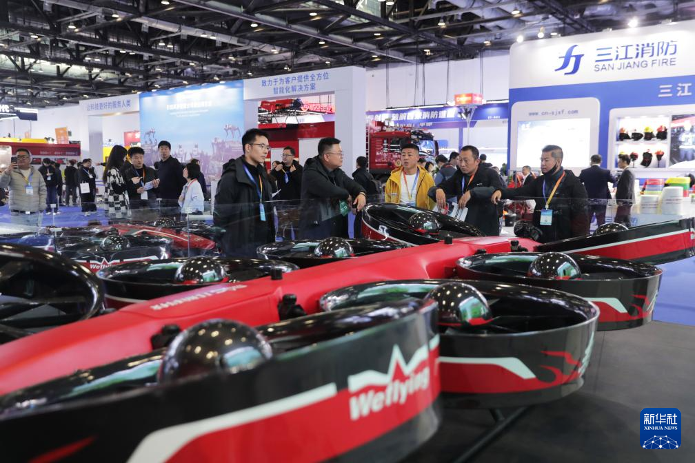 11月18日,观众在2025中国国际应急管理展览会玮航科技展位参观。新华社记者 郭昱 摄