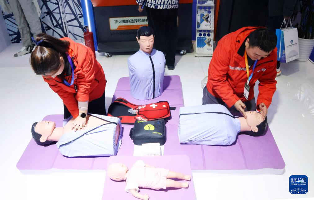 11月18日,工作人员在展览现场向观众演示紧急救护方法。新华社记者 潘旭 摄