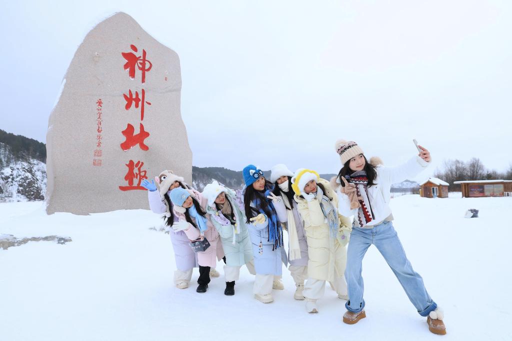11月22日,游客在漠河北极村“神州北极”碑前打卡拍照。新华社发(徐率摄)