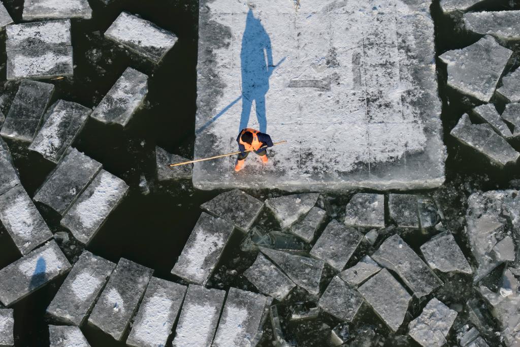 工人在松花江哈尔滨段采冰(无人机照片)。新华社记者 张涛 摄