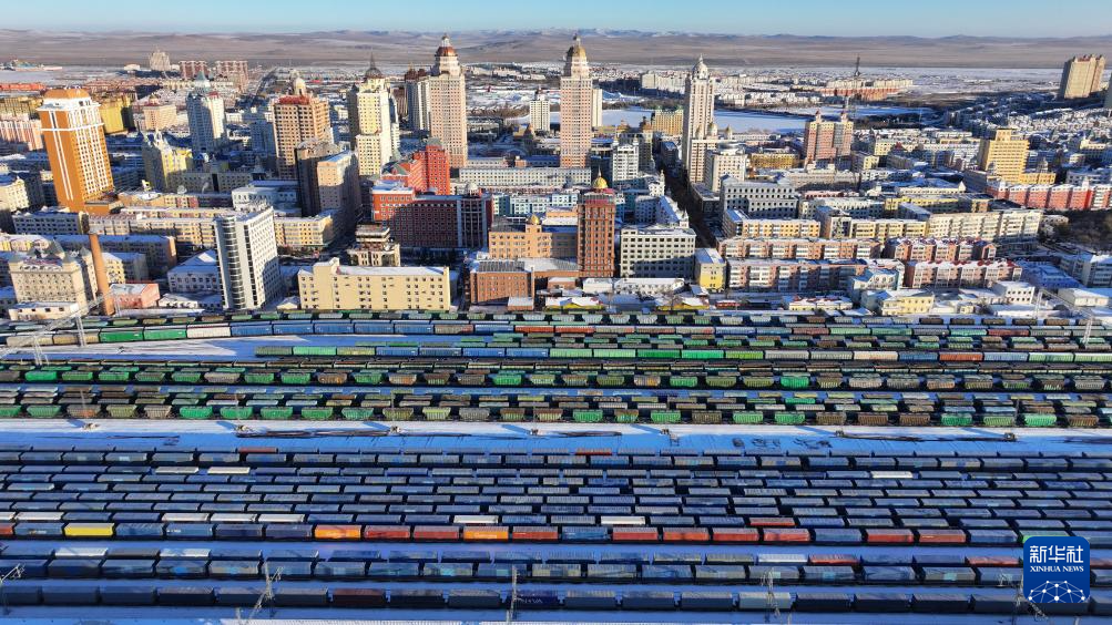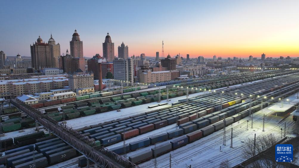 12月10日,中欧班列在中国铁路哈尔滨局集团有限公司满洲里站整装待发(无人机照片)。新华社发(黄旭摄)