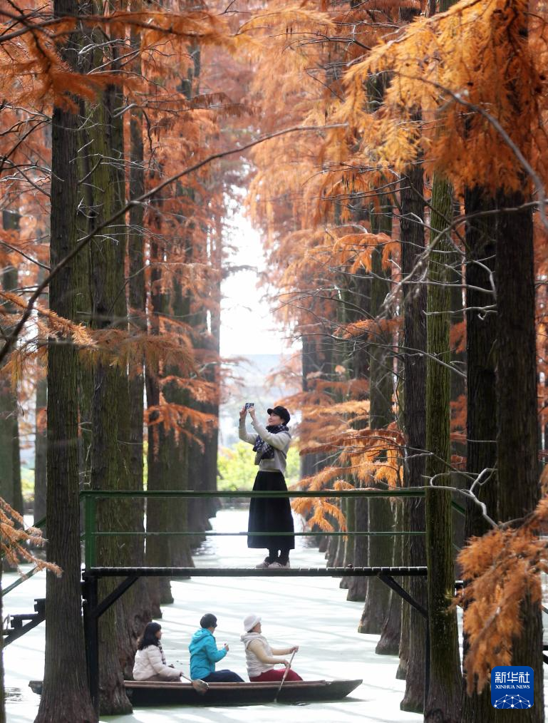12月9日,游客在江苏省扬州市渌洋湖湿地公园的“水上森林”拍照游览。新华社发(孟德龙摄)