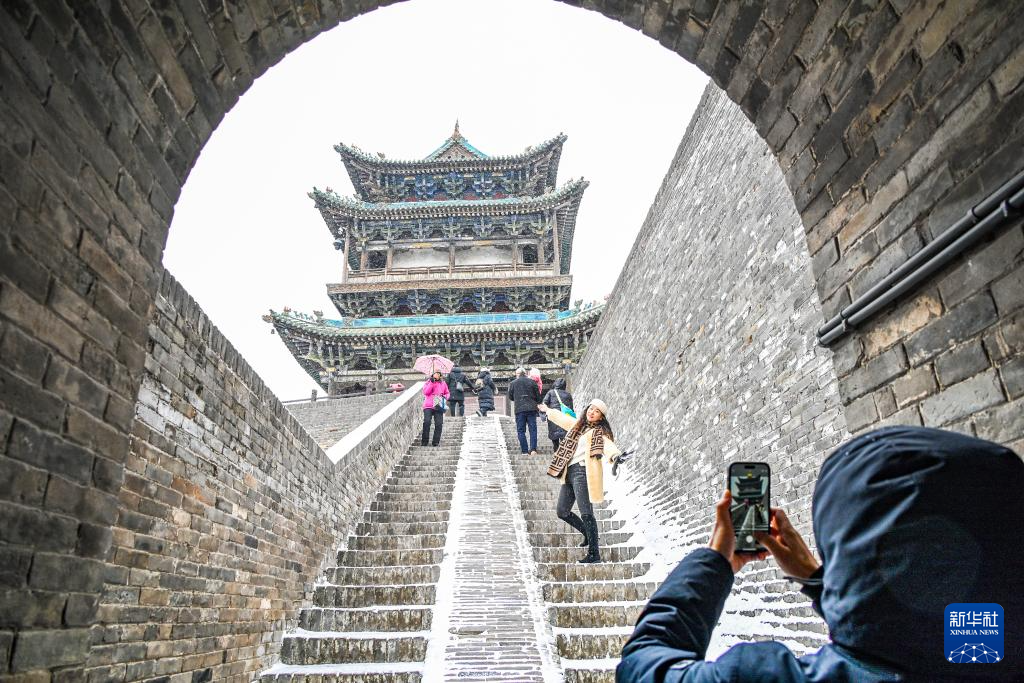 12月12日,游客冒雪在位于山西省晋中市的平遥古城游览观光。新华社发(梁生仁摄)