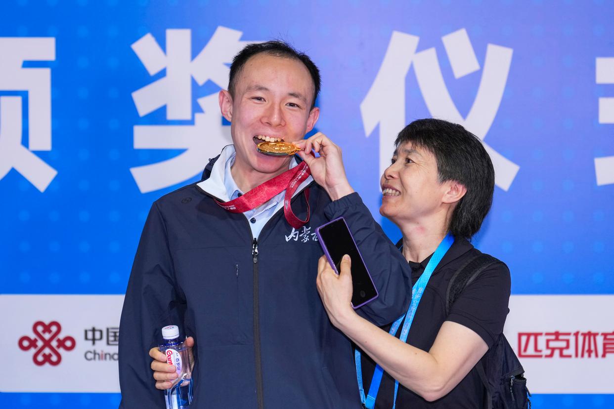 12月12日,孙宇亮(左)和母亲在男子22-29岁组50米自由泳第1组颁奖仪式后合影,孙宇亮在比赛中获得冠军。新华社记者 伍志尊 摄