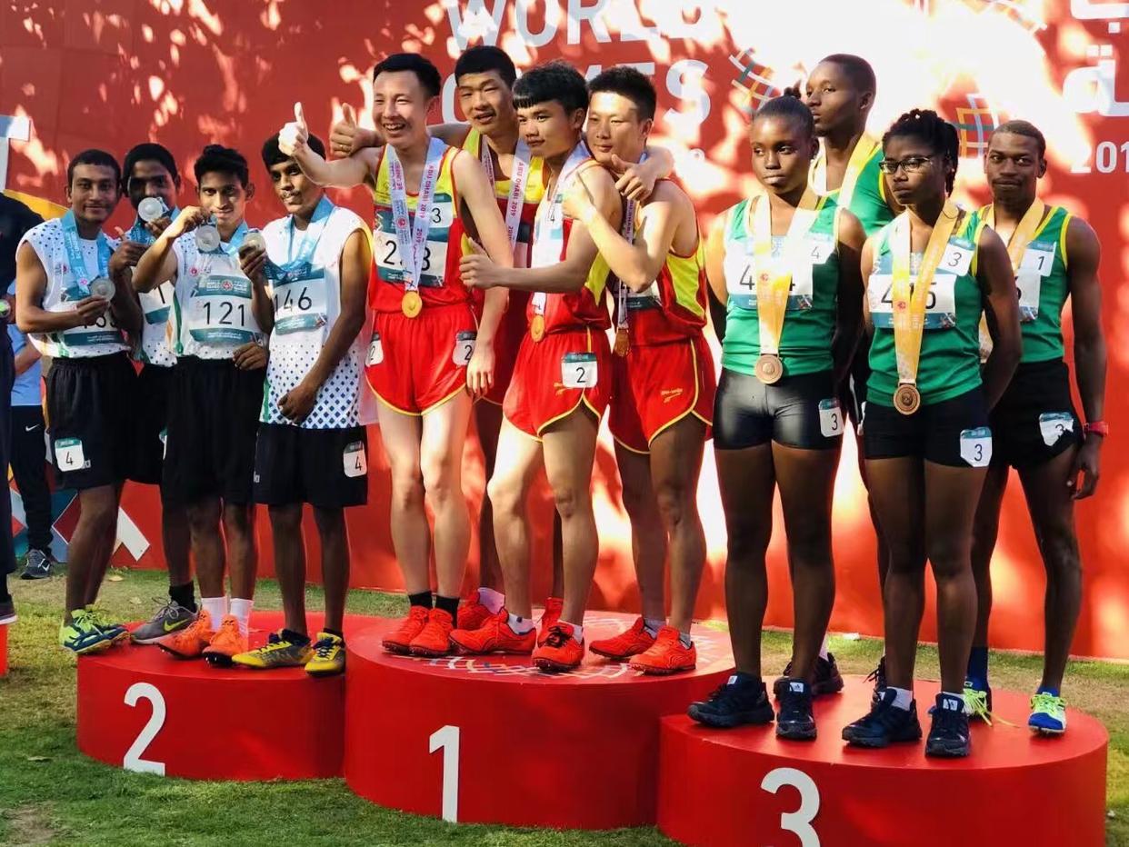 2019年3月,在阿联酋迪拜举行的第15届世界夏季特殊奥林匹克运动会田径项目比赛中,获得男子4X400米接力冠军的中国队选手孙宇亮(左五)与队友在颁奖仪式上庆祝。新华社发