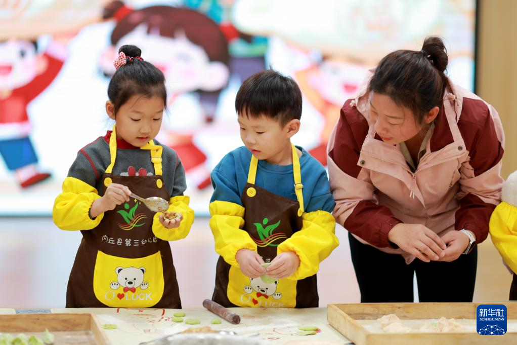 12月19日,在河北省石家庄新乐市市直第二幼儿园,老师教小朋友包饺子。新华社发(贾敏杰摄)