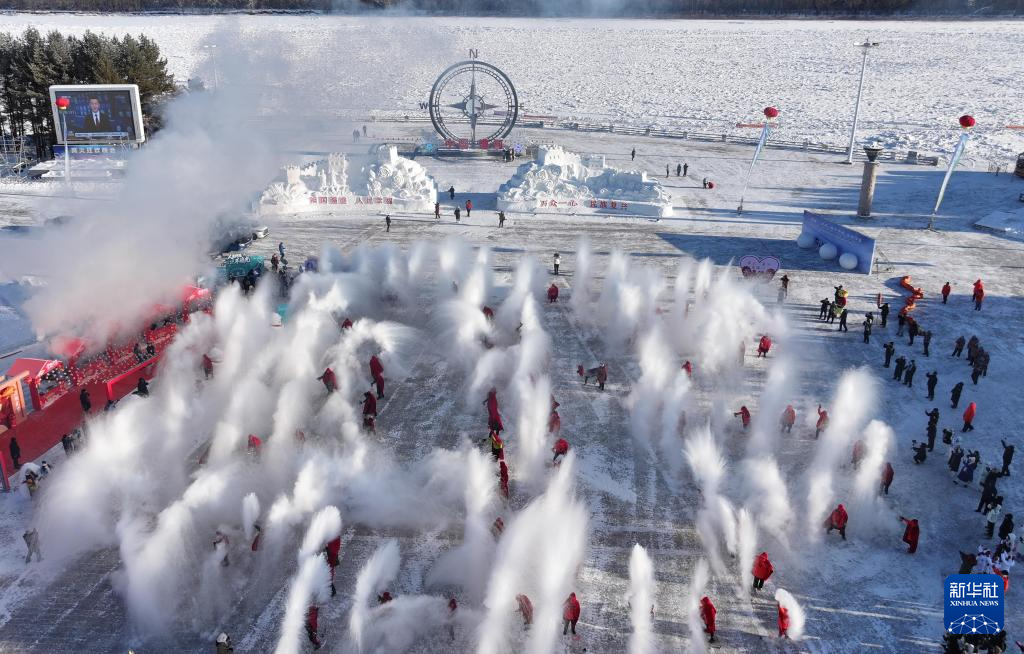 12月21日在北极村七星广场拍摄的“泼水成冰”表演(无人机照片)。新华社发(邵天李摄)