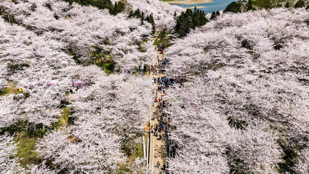 3月26日,游客在贵州省贵安新区樱花园内赏花游玩(无人机照片)。