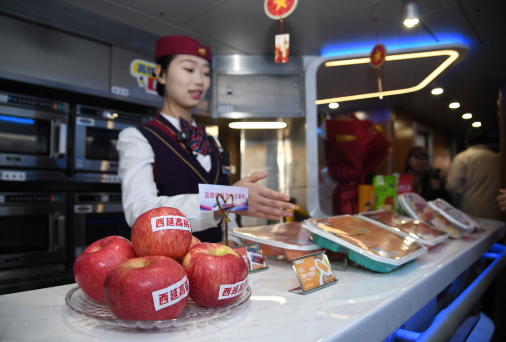 ↑ 12月26日,乘务员在西延高铁首发列车上向乘客介绍延安特产。新华社记者 张博文 摄