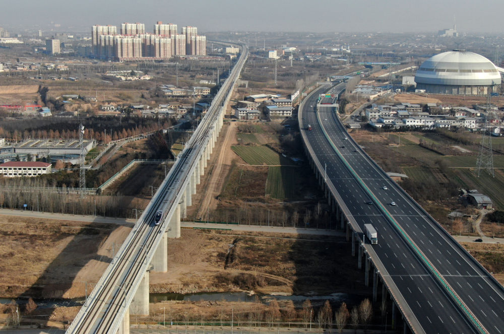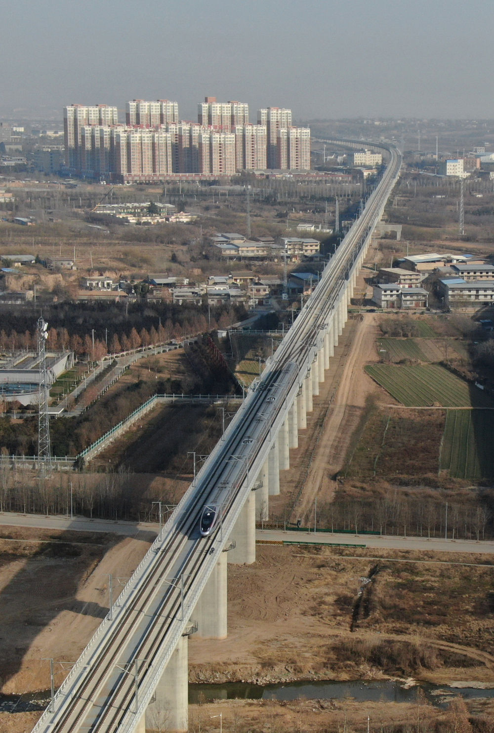 ↑ 12月26日,西安开往延安的西延高铁列车驶过富平特大桥(无人机照片)。新华社发(国铁西安局供图)