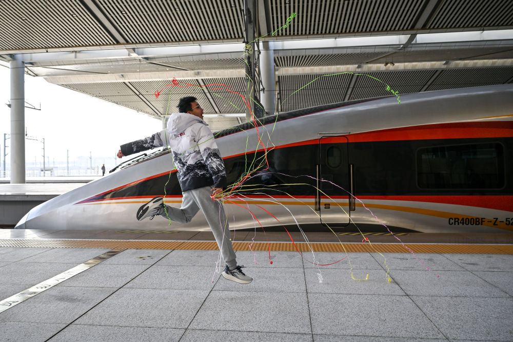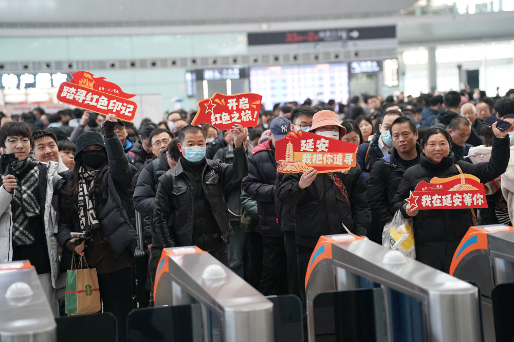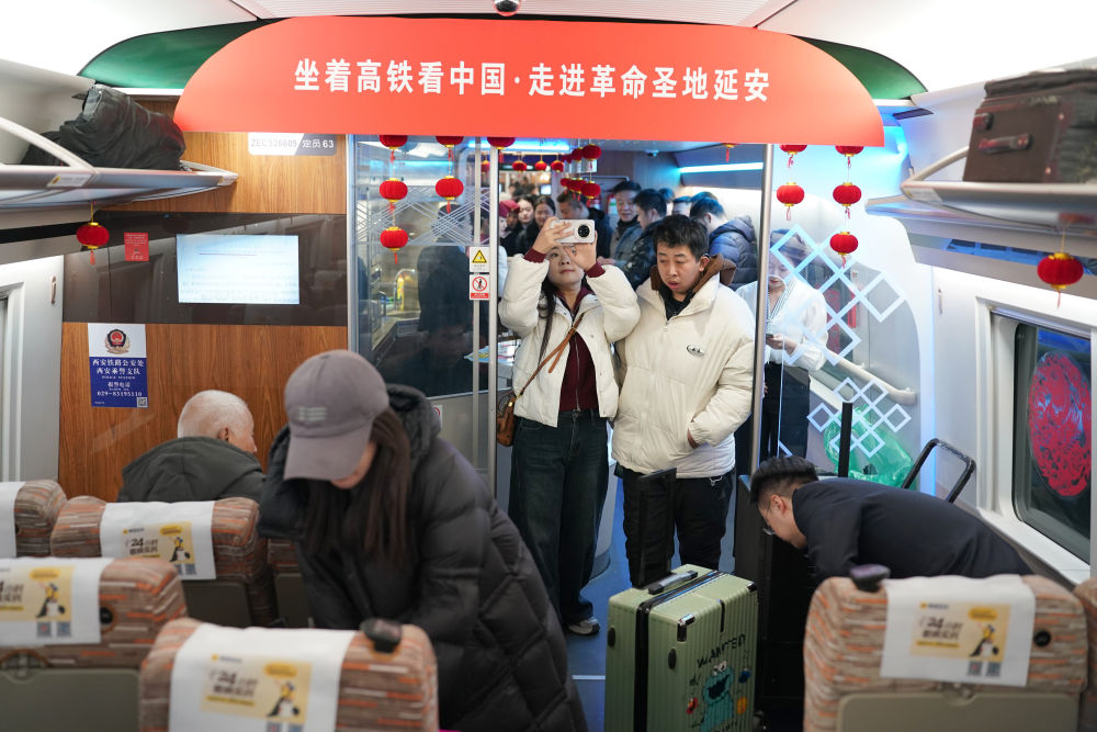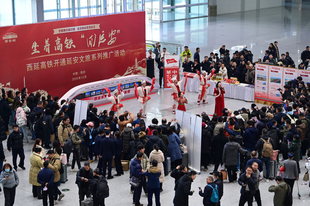 ↑ 12月26日,媒体记者在西安北站采访拍摄西延高铁开通延安文旅系列推广活动。新华社记者 邹竞一 摄