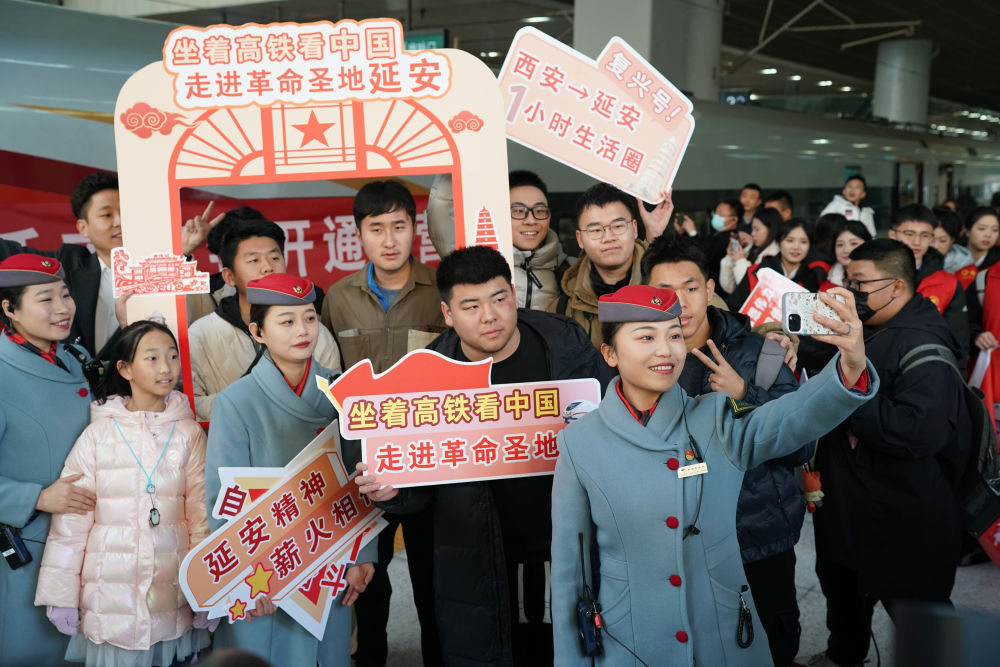 ↑ 12月26日,乘客和乘务人员在西安开往延安的西延高铁C9312次首发列车前拍照留念。新华社记者 邵瑞 摄