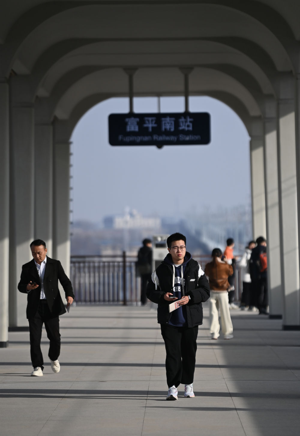 ↑ 12月26日,乘客在西延高铁富平南站站台上准备出站。新华社记者 李一博 摄