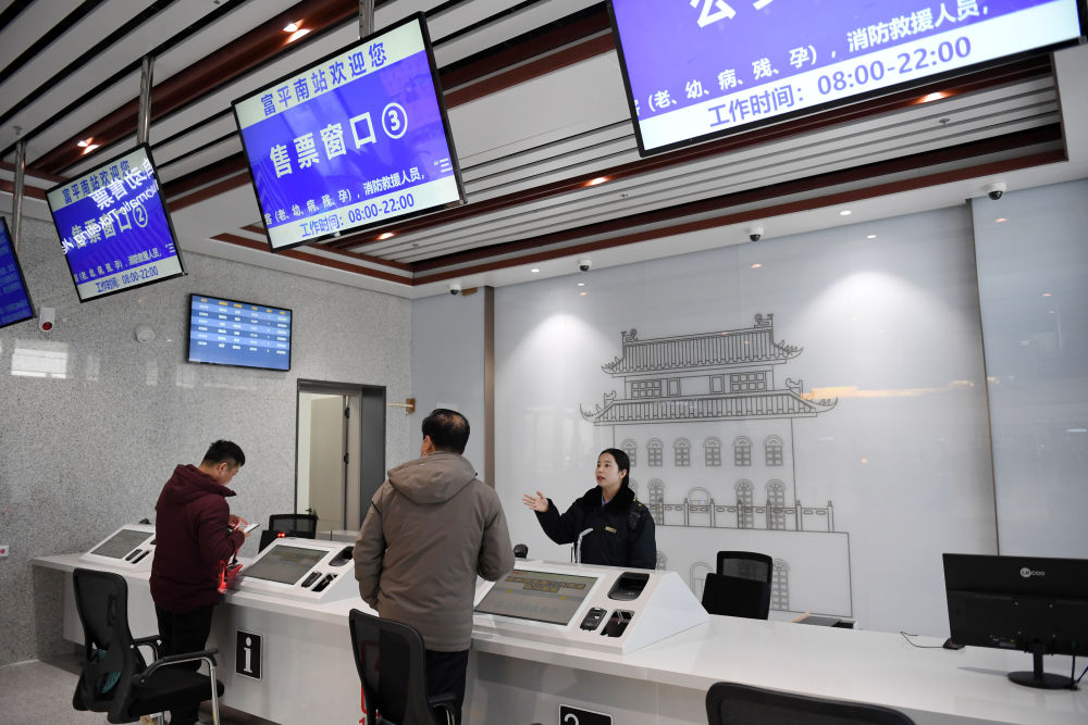 ↑ 12月26日,乘客在西延高铁富平南站售票窗口购票。新华社记者 李一博 摄