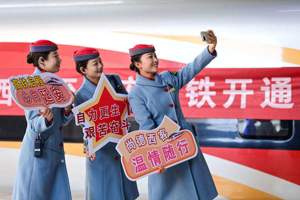 ↑ 12月26日,乘务员在由西安开往延安的西延高铁首发列车前合影。新华社记者 邹竞一 摄
