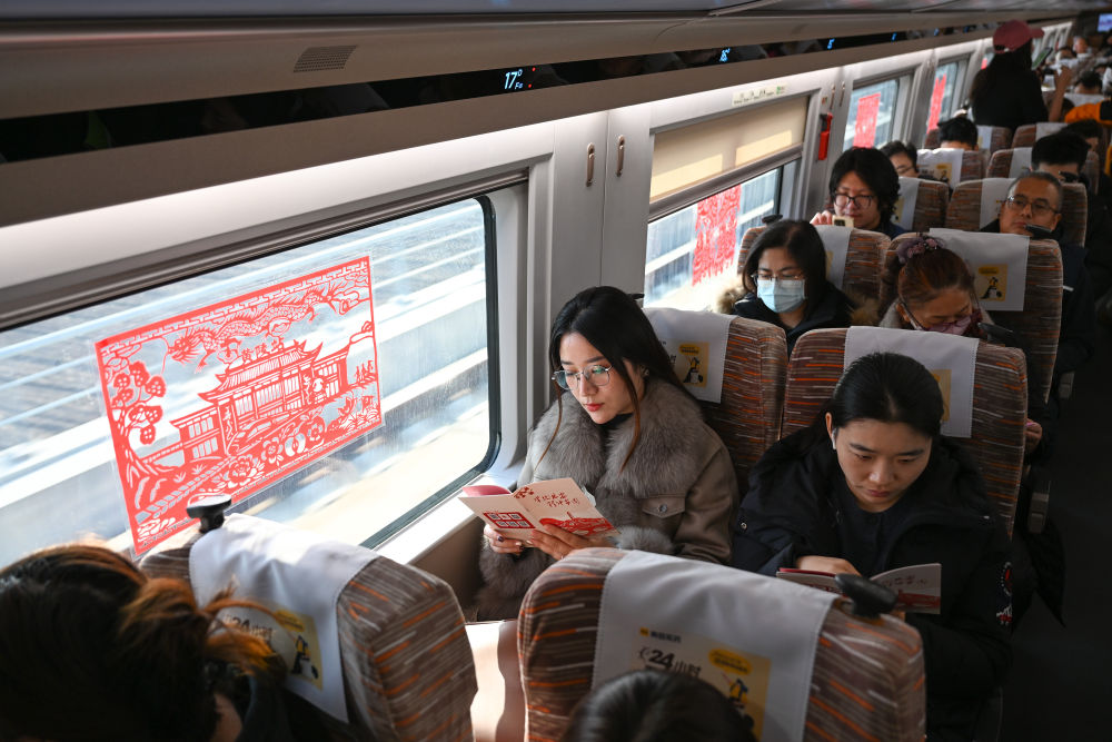 ↑ 12月26日,乘客在西安北至延安C9312次列车上阅览延安文化推广手册。新华社记者 邹竞一 摄