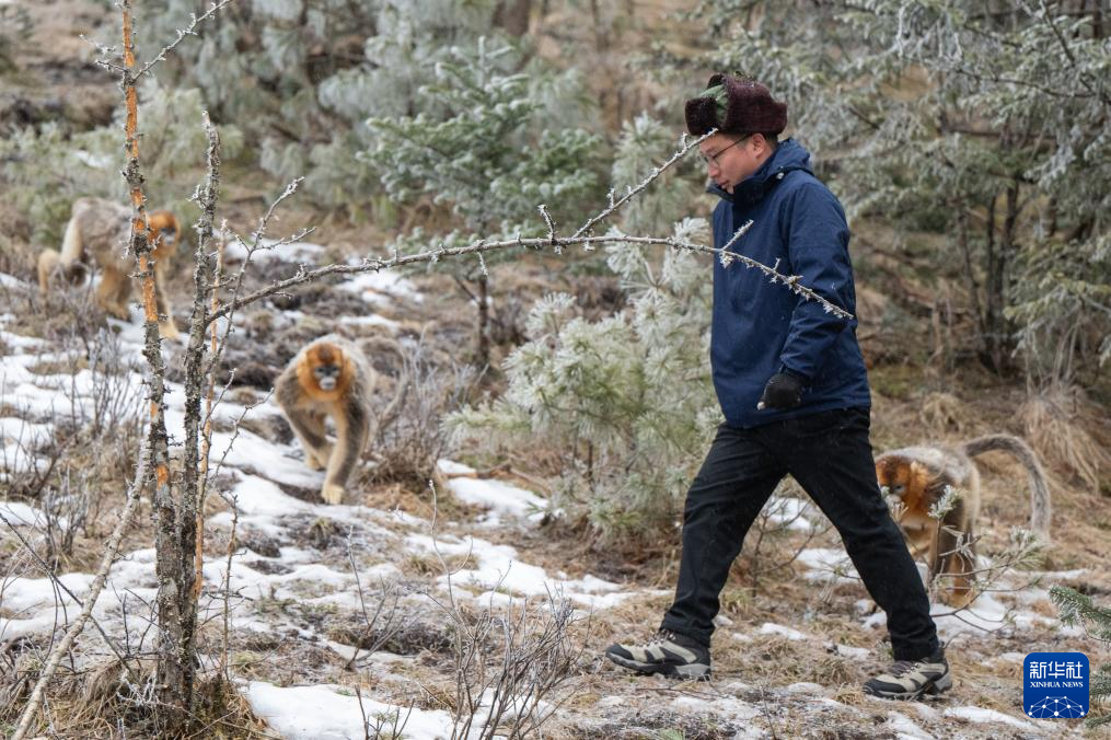 1月19日,研究员李书航在神农架国家公园大龙潭金丝猴野外研究基地查看金丝猴群情况。新华社记者 杜子璇 摄