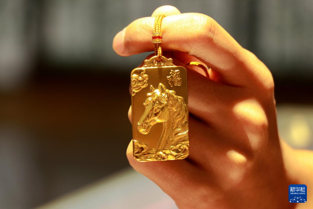 1月16日,在贵州省黔东南苗族侗族自治州从江县一家黄金店,店员在展示生肖马主题的黄金饰品。新华社发(罗京来摄)