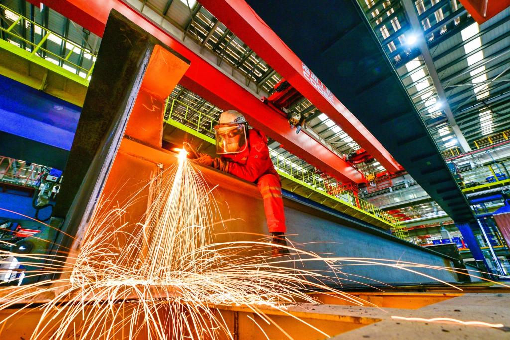 1月19日,在天津市滨海新区,海上油气平台建设工人进行气割作业。新华社发(杜鹏辉摄)