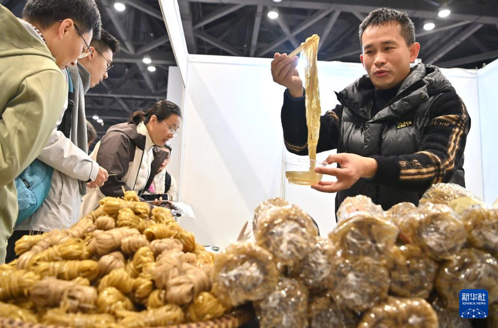 1月24日,在广西南宁国际会展中心,一名参展商在年货大集上展示红薯粉条。新华社记者 周华 摄