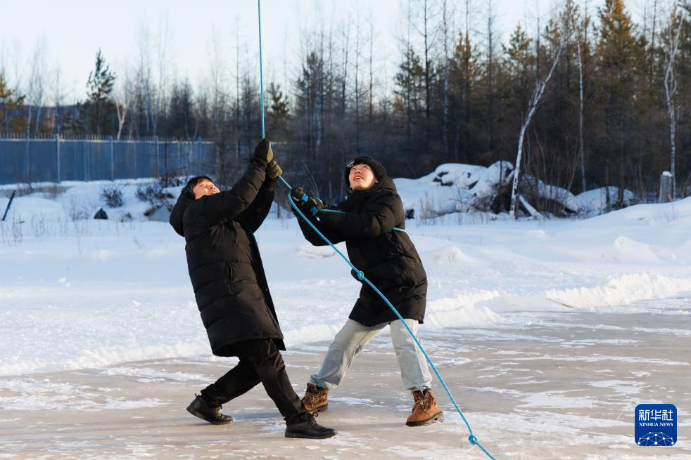 1月25日,工作之余,田冬在玩泼水成冰。新华社记者 金立旺 摄