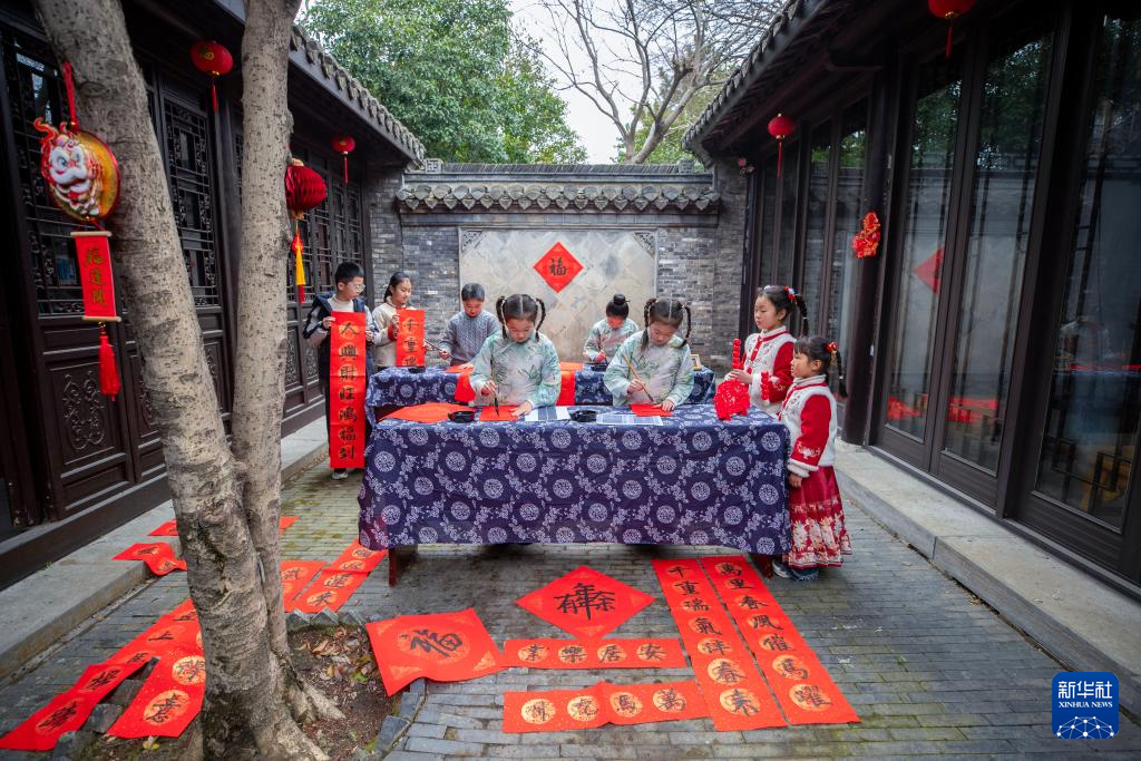 2月13日,在江苏省兴化市昭阳街道开展的“书香里的年味”新春主题活动中,小书法爱好者现场书写春联。新华社发(周社根摄)