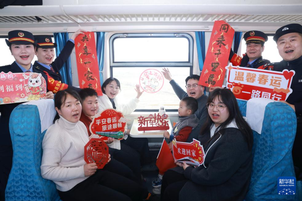 2月13日,在武昌开往安陆K5438次临客列车上,列车工作人员和旅客共迎新春。新华社发(赵军摄)