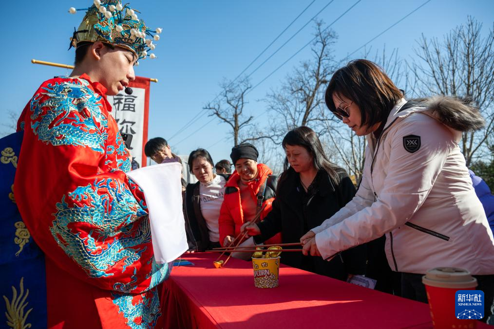 2月19日,在北京市海淀区凤凰岭第十三届新春非遗游园会上,游客与工作人员互动。新华社记者 胡竞文 摄