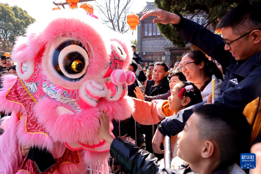 2月20日,在山东省枣庄市台儿庄古城举办的新春大庙会上,游客与舞狮互动。新华社发(孙中喆 摄)