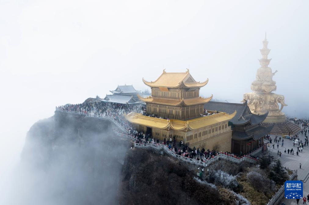 四川峨眉山景区的金顶,祥云翻涌,游人络绎不绝(2月20日无人机摄)。新华社记者 江宏景 摄